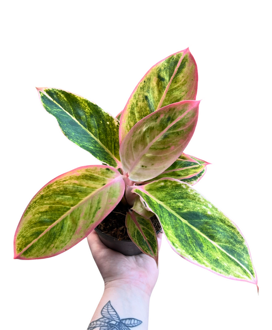 Aglaonema is part of the Araceae family, its native range is from NE. India to Papua New Guinea. These decorative plants are widely cultivated with dramatic colour variations. This cultivar has green leaves with splashes of chartreuse and light pink. Leaf margins, midribs and petioles are light pink.