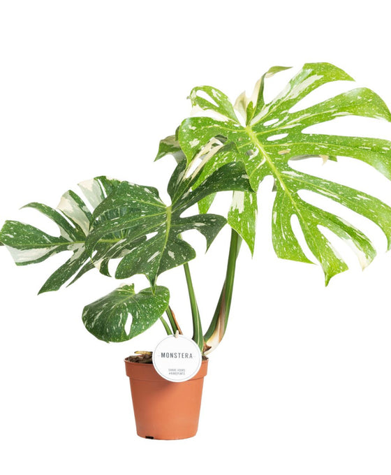 Monstera 'Thai Constellation' is a beautiful variegated plant, unlike M. albo borsigiana it owes its variegation to a mutation so these plants are cloned through tissue culture. Variegation tends to be more creamy-yellow in colour than the M. albo borsigiana, it is speckled and unpredictable - hence the name ‘Constellation’, the variegation is also stable (white parts won’t revert to green). Internodal spacing is generally a lot shorter in M.Thai Constellation. You can expect this plant to grow fairly large.