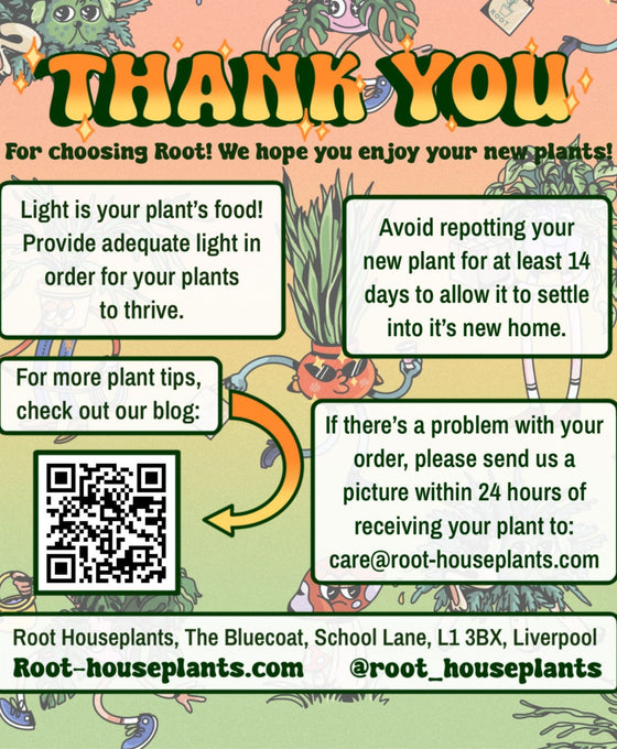 To allow the plant to acclimatise in its new home, there should be no repotting of the plant for a minimum of 14 days after receipt. If any plant has been repotted or a cutting has been taken then we are not able to accept returns.