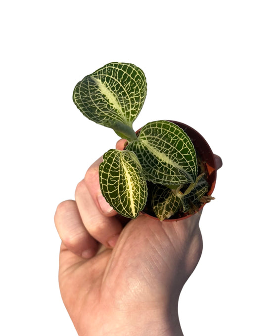 Anoectochilus siamensis X Roxburghii is a jewel orchid hybrid from the Orchidaceae family with round, green leaves and silvery veining.