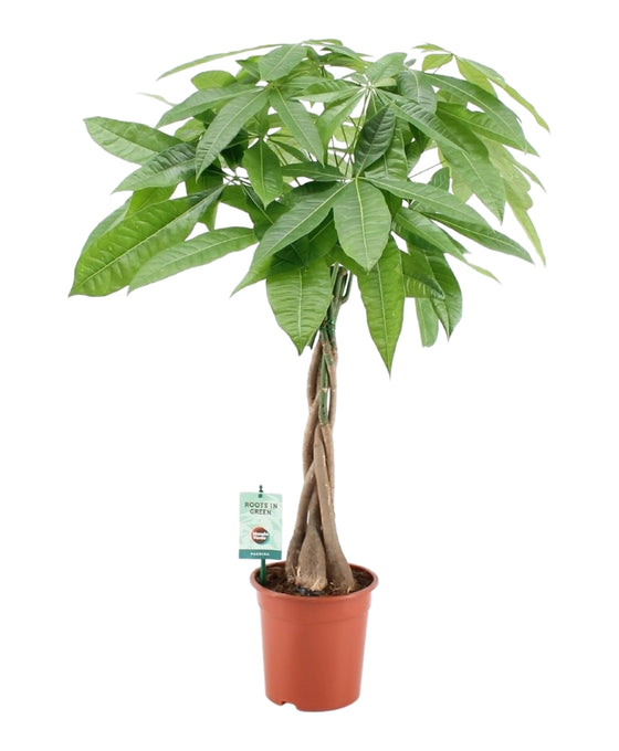 Pachira aquatica are part of the Malvaceae family and its native range is Mexico to northern South America. In the wild it grows as a tropical estuarine species in freshwater swamps and river banks. Leaves are palmate with 5-9, elliptic shaped leaflets. As the plant matures they develop swollen trunks and are typically raised by braiding 4 stems together.