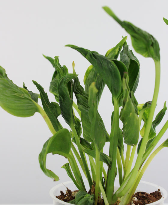 Epipremnum aureum is part of the Araceae family, its native range is Society Islands (Moorea). ‘Shangri la’ is a cultivar, it has a climbing growth habit and is sometimes labelled ‘Godzilla’ or 'Green Javelin'; there is little information about the origins of this plant. Leaves are contorted and tough with yellow variegation.