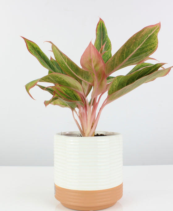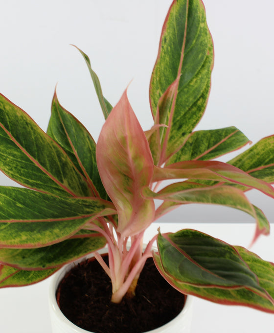 Aglaonema 'Golden Lipstick' is a cultivar from the Araceae family, Aglaonema are native to tropical Asia and New Guinea. Leaves are elliptic in shape, leaf margins and midribs are pink.