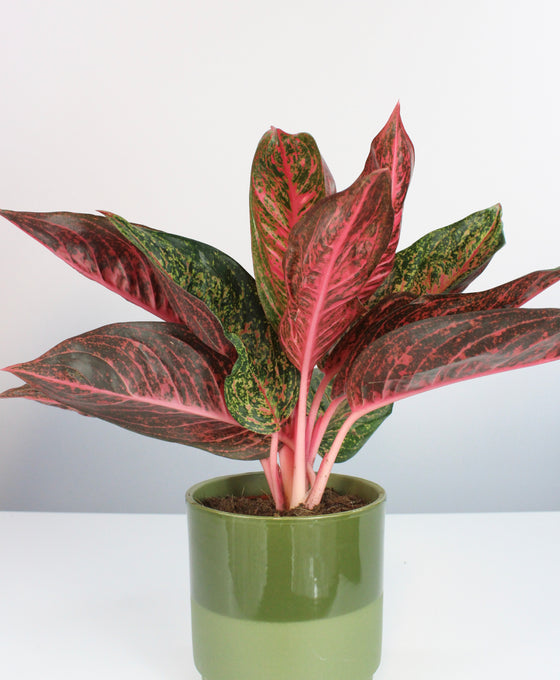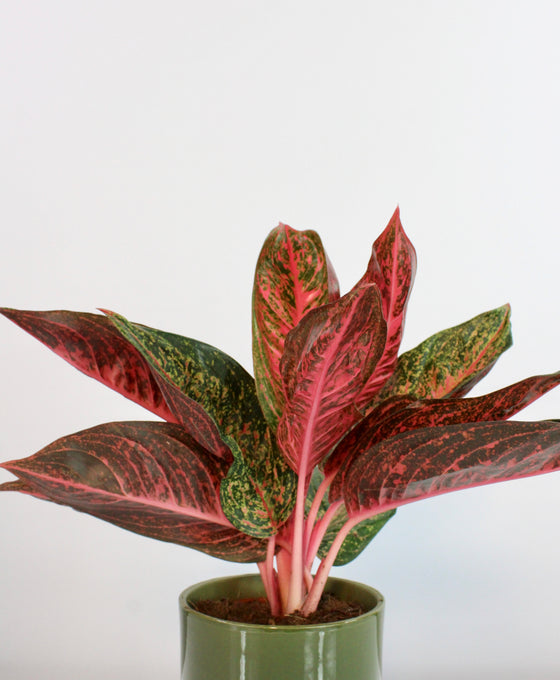 Aglaonema is part of the Araceae family, its native range is from NE. India to Papua New Guinea. These decorative plants are widely cultivated with dramatic colour variations. The Tiara has elliptic to lance-shaped leaves, pink petioles and midribs as well as striking pink undersides. This plant is variegated so requires more light than green Aglaonema.